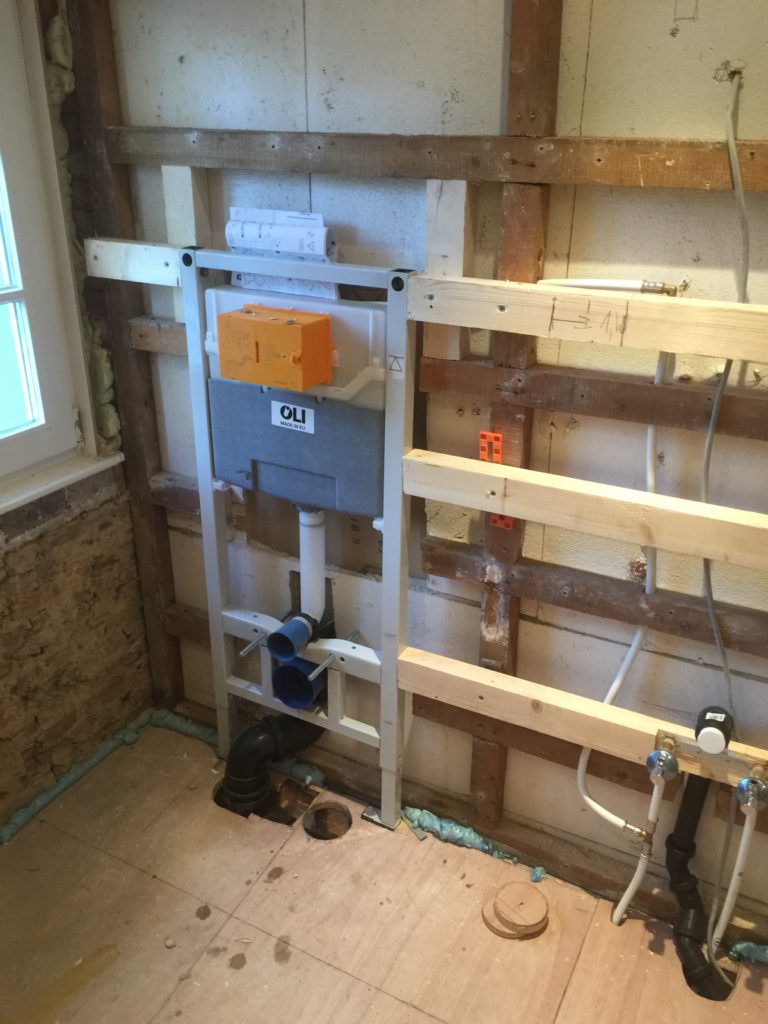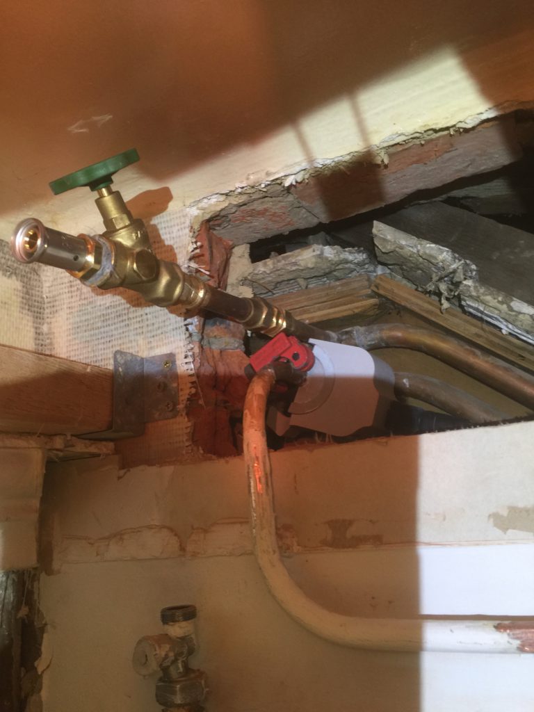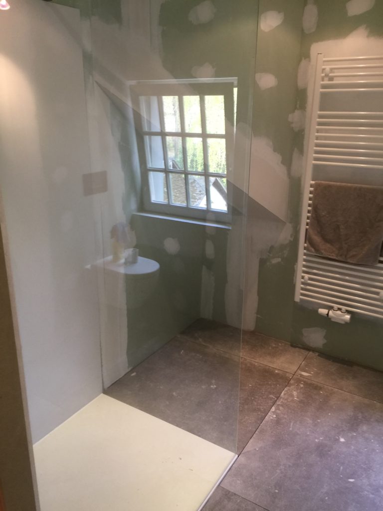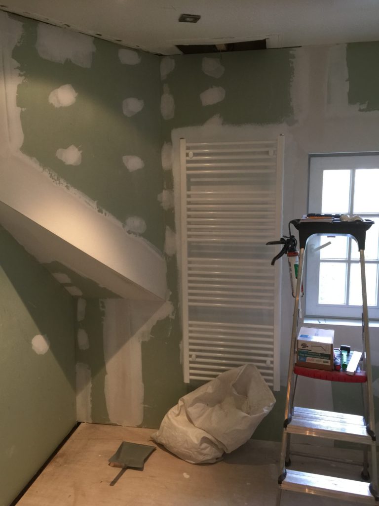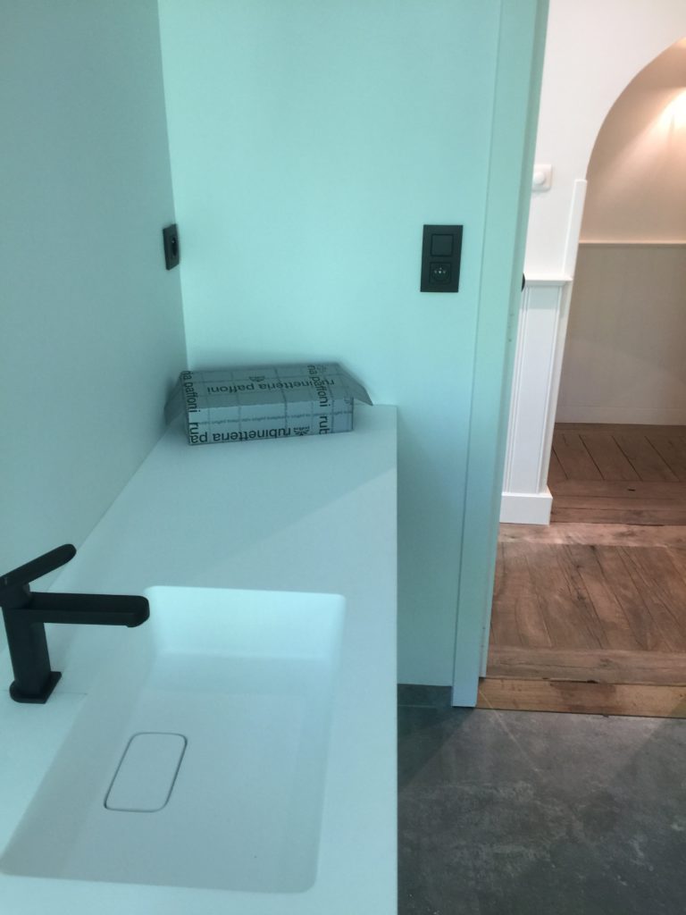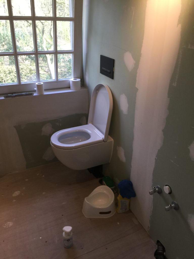 Nieuwe afvoerbuizen loden vervangen – wegbreken oud sanitair en leveren en plaatsen van nieuw instapdouche – inbouwtoiletten – lavabo’s – plaatsen van vloertegels – bijplaatsen van cv, bevriezen van leidingen enz..- elektriciteit aangepast, nieuwe leidingen en voorbereiding van later alles aan te passen en een keuring uit te voeren – plaatsen van verlichting.