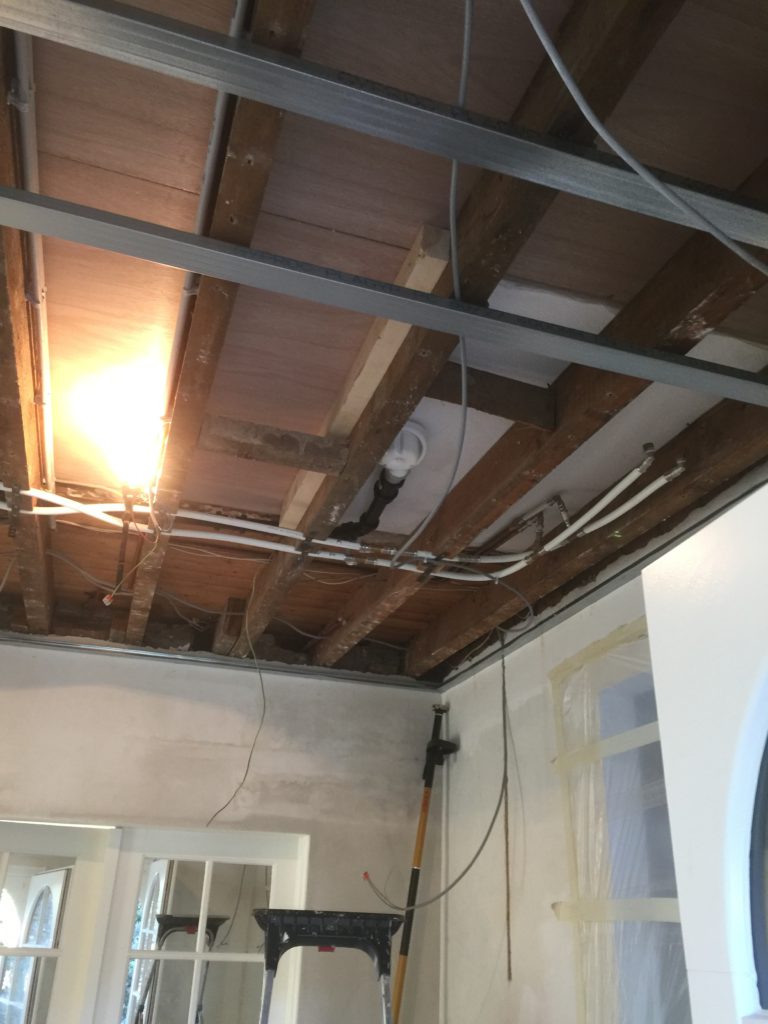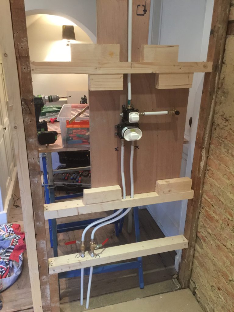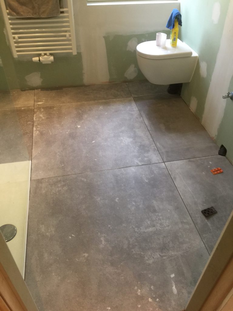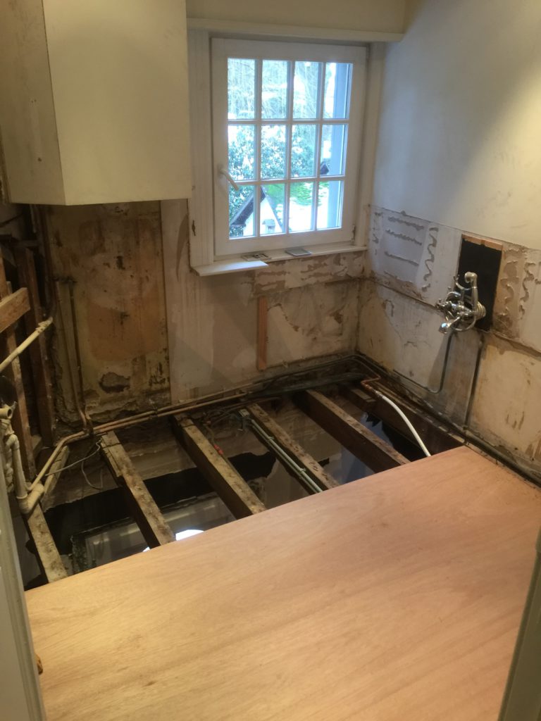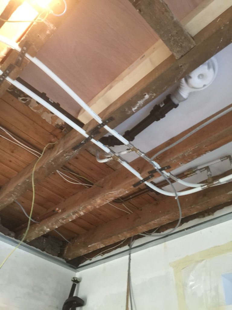 Nieuwe afvoerbuizen loden vervangen – wegbreken oud sanitair en leveren en plaatsen van nieuw instapdouche – inbouwtoiletten – lavabo’s – plaatsen van vloertegels – bijplaatsen van cv, bevriezen van leidingen enz..- elektriciteit aangepast, nieuwe leidingen en voorbereiding van later alles aan te passen en een keuring uit te voeren – plaatsen van verlichting.