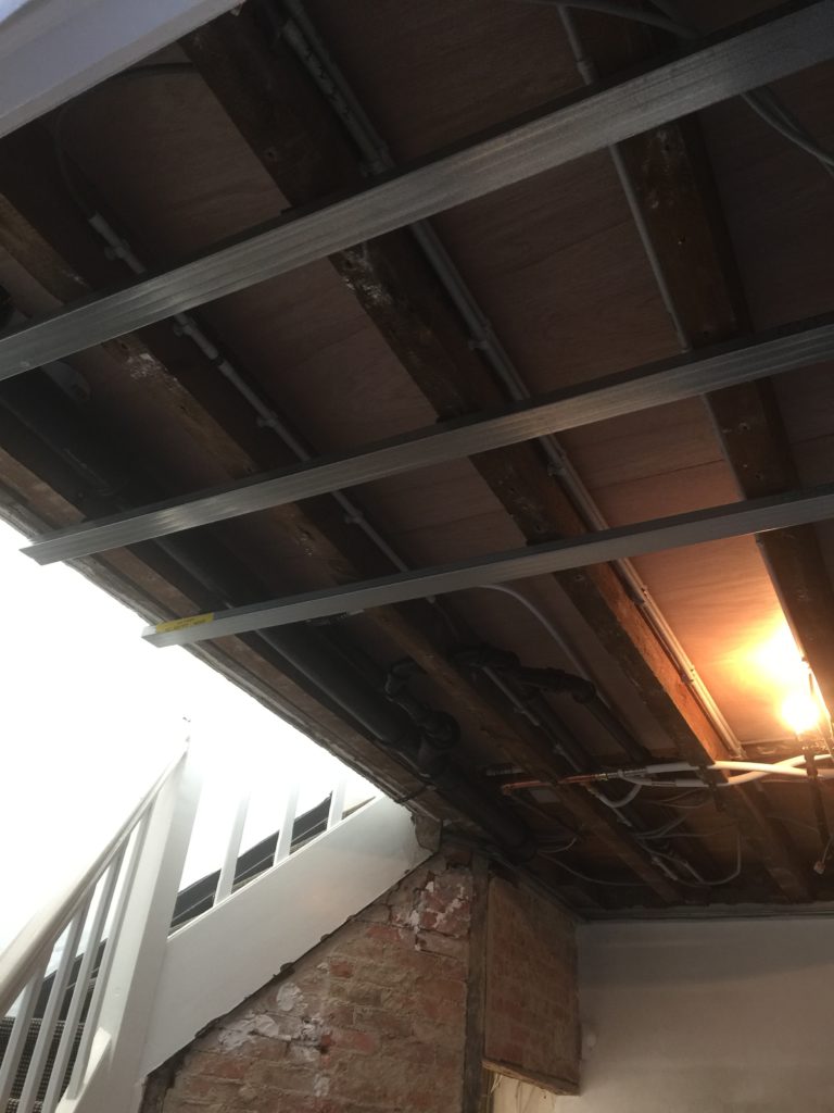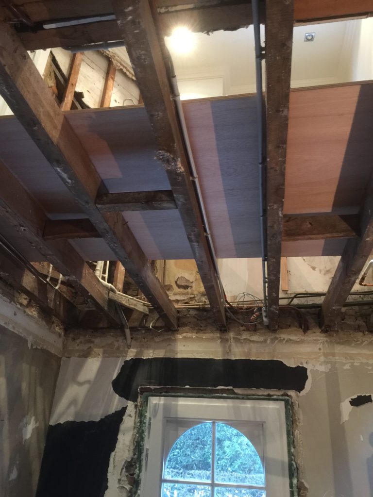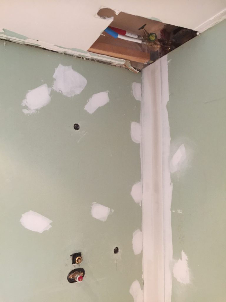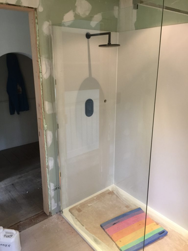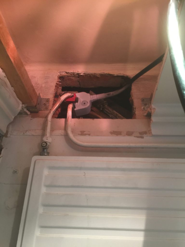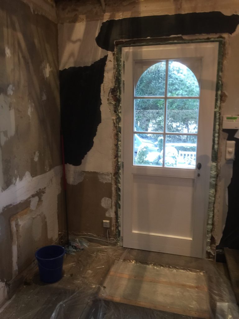 Nieuwe afvoerbuizen loden vervangen – wegbreken oud sanitair en leveren en plaatsen van nieuw instapdouche – inbouwtoiletten – lavabo’s – plaatsen van vloertegels – bijplaatsen van cv, bevriezen van leidingen enz..- elektriciteit aangepast, nieuwe leidingen en voorbereiding van later alles aan te passen en een keuring uit te voeren – plaatsen van verlichting.