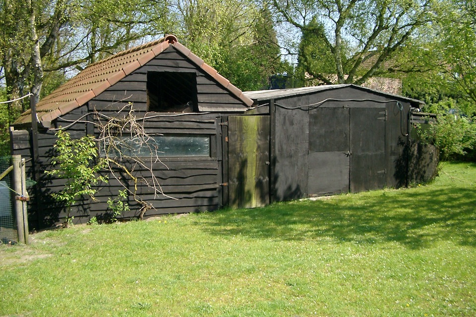 Hier ziet u een tuinhuis voor en na renovatie door De Karweier. De volledige buitenwand werd bekleed met cederhout. We plaatsten ook nieuwe ramen en deuren.